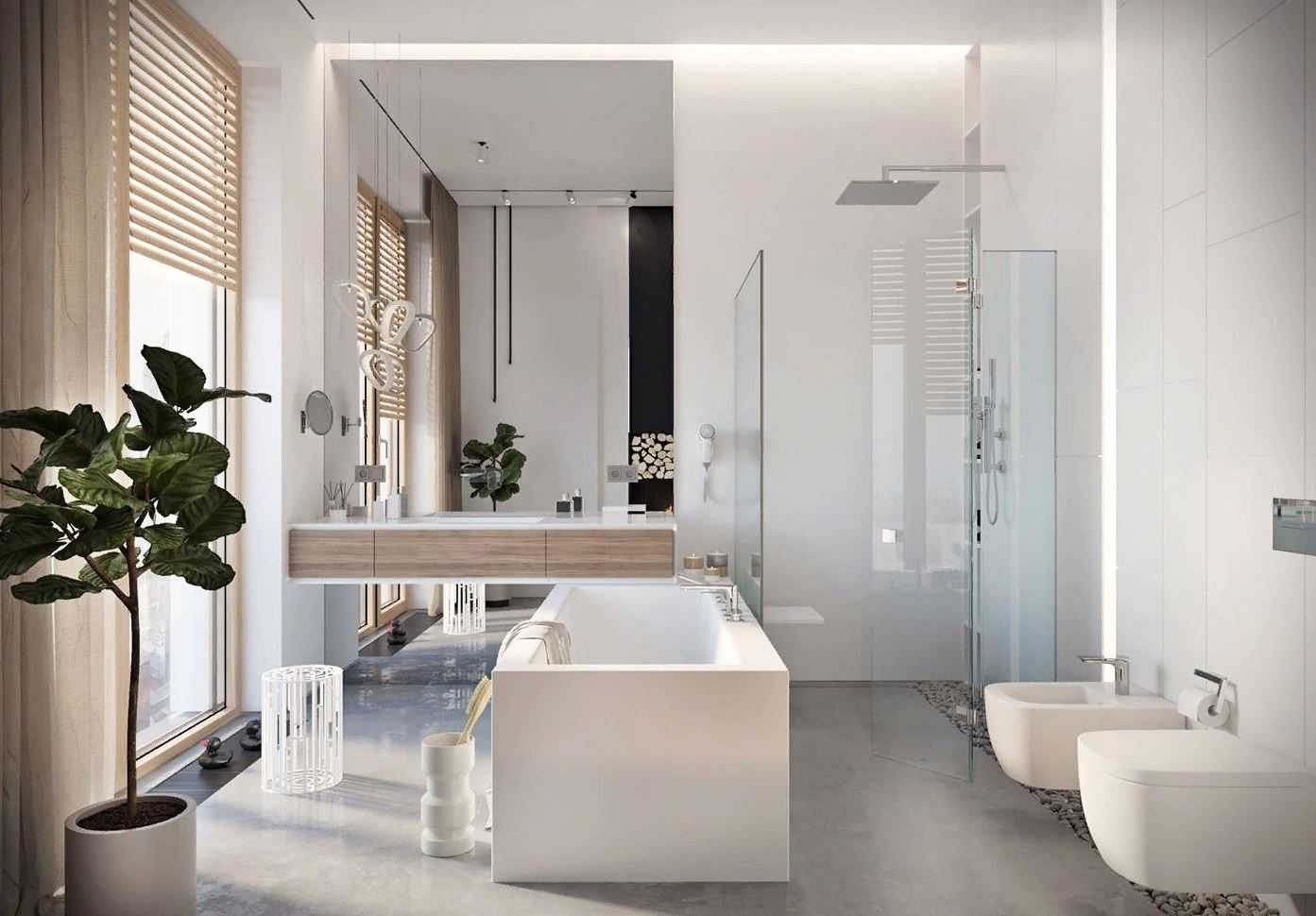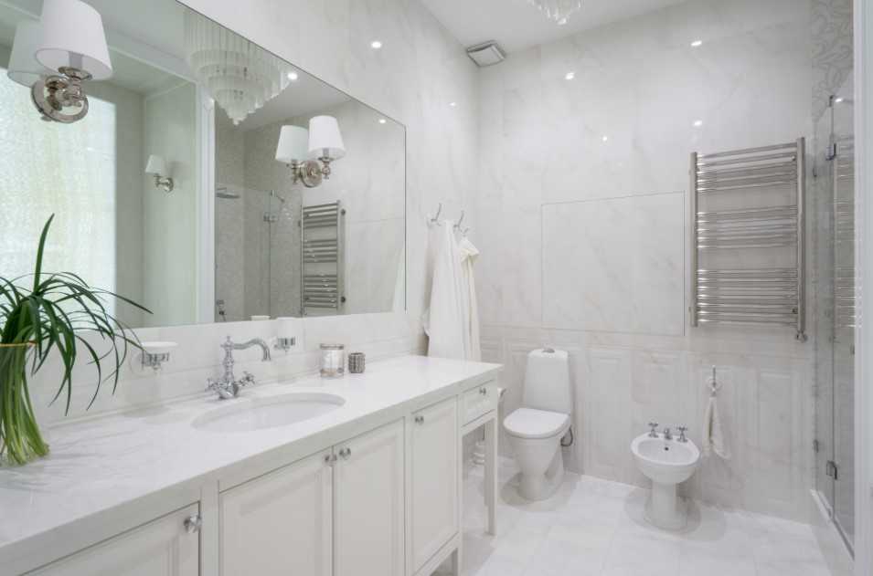 Гладкий белый потолок – основное направление дизайна ванной комнаты в 2017 году