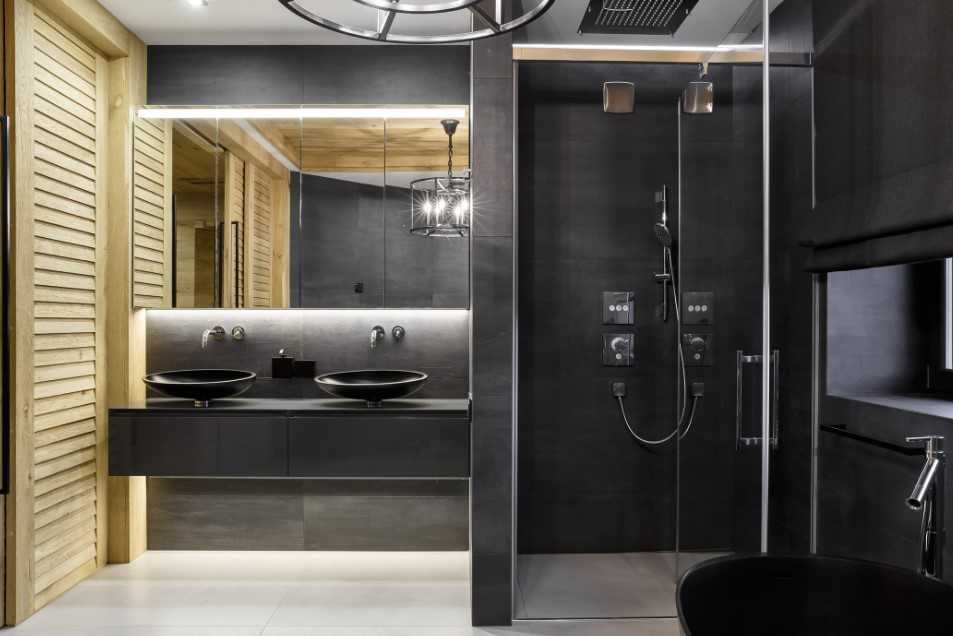 Если вы задумали реализовать дизайн ванной комнаты в 2022 году в стиле лофт или умеренный минимализм, рекомендуется добавить в качестве акцента черные детали. Как это сделать грамотно, вы можете видеть на фото. Это могут быть современные сантехнические элементы, аксессуары для ванной или декорированные составляющие.