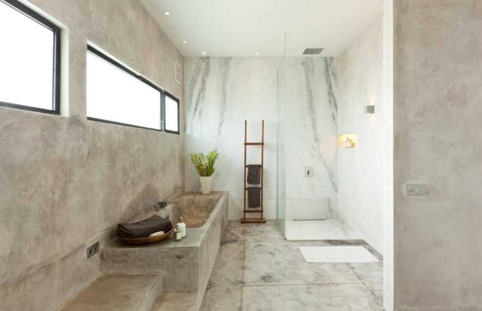 Традиционная плитка для ванной и современный стиль хорошо сочетаются. Но современные модные ванные комнаты – это не только керамика. Стены можно отделать водостойкой штукатуркой, имитирующей бетон.