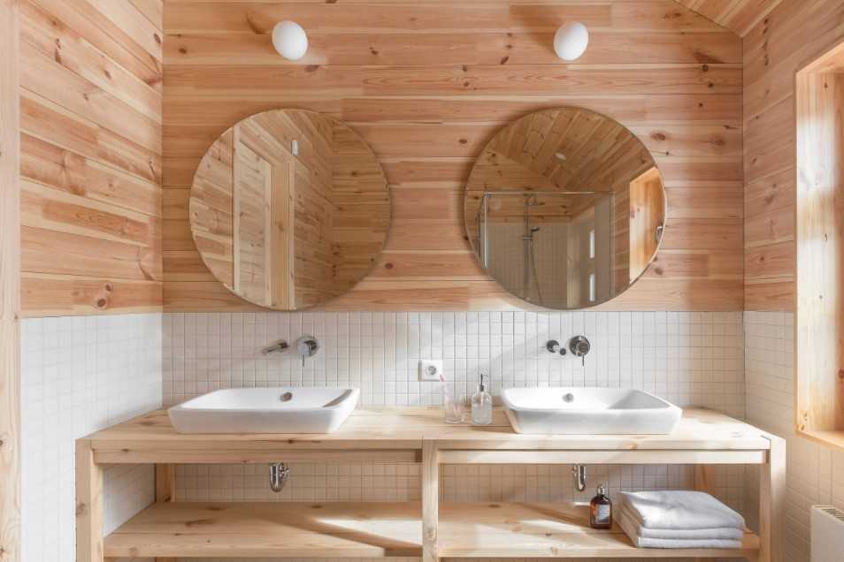 Дерево нечасто используют при отделке ванных комнат, но оно может быть там уместно. Для этого нужно выбирать устойчивые к воде виды древесины и обработать их специальным влагоотталкивающим составом. Вагонка предает помещению эдакий «деревенский» стиль и ваша ванна становиться уютной, словно вы в бане где-то в сельской местности.