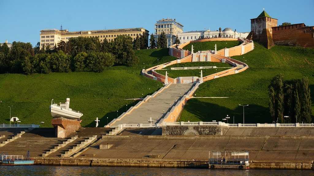 Визитная карточка города – Чкаловская лестница, также расположенная в историческом центре. Это сооружение производит грандиозное впечатление своими масштабами. Построили ее после окончания Великой Отечественной войны. Лестница имеет форму цифры «8» и насчитывает 560 ступеней. Наверху – смотровая площадка с видом на Волгу. Другая возможность полюбоваться городом с высоты – канатная дорога длиной 4 км, ведущая к нижегородскому городу-спутнику Бору.