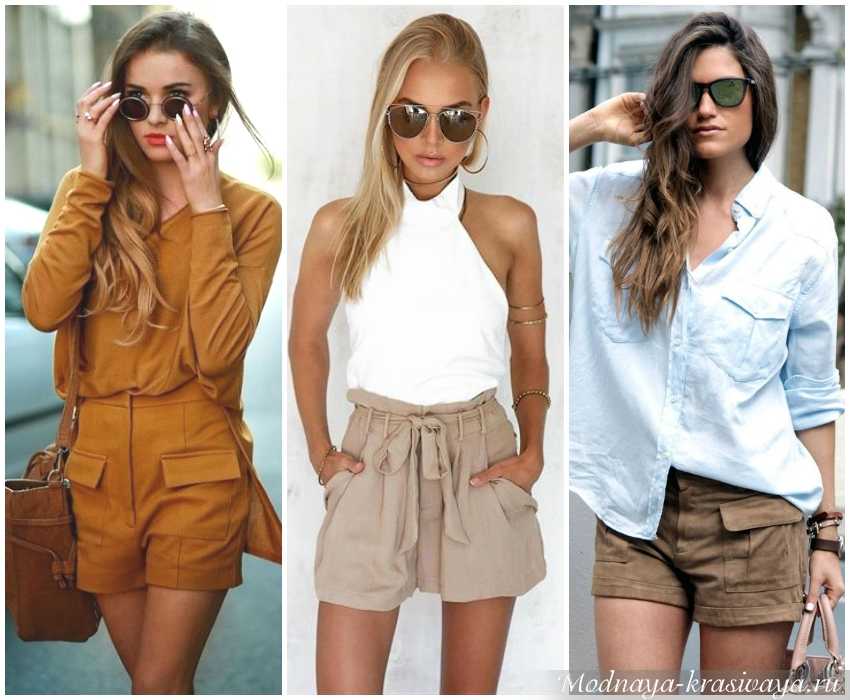 Могут сочетаться с топами на тонких бретелях, майками и рубашками, обязательно заправленными в шорты, чтобы не потерять талию. Девушкам с фигурой песочные часы можно носить любой фасон шорт без ограничения — поэтому смотрим на свои фигурки и внимательно изучаем какие фасоны шорт нам подойдут больше всего.