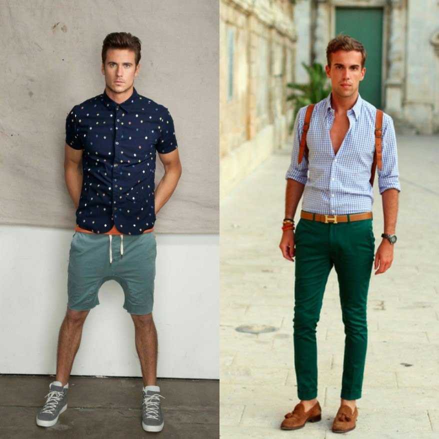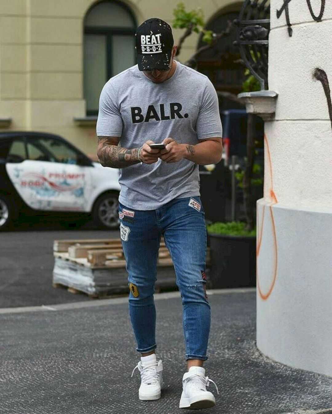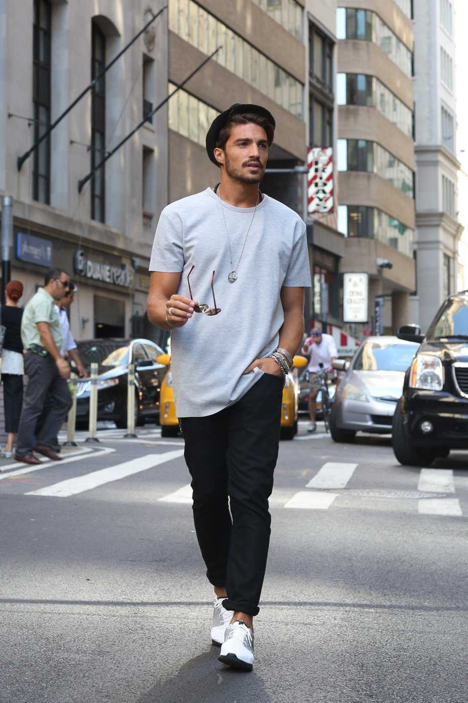 В этом предмете гардероба у мужчин есть 2 кардинально противоположных варианта. В одной стороны в моде по-прежнему модели оверсайз и крупным вырезом, с другой – популярны обтягивающие футболки светлых оттенков. Носить их можно с подвернутыми джинсами или брюками-бананами. В качестве низа отлично подойдут белые кроссовки или легкие кеды.