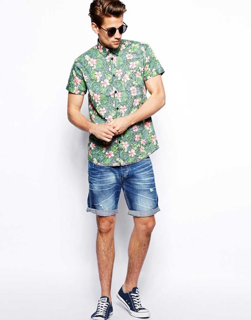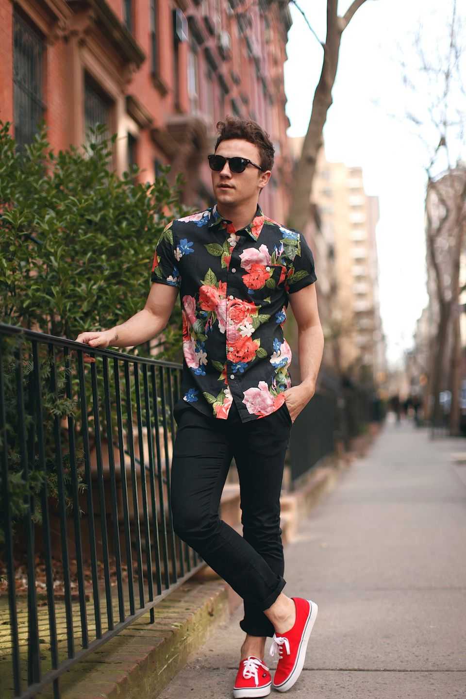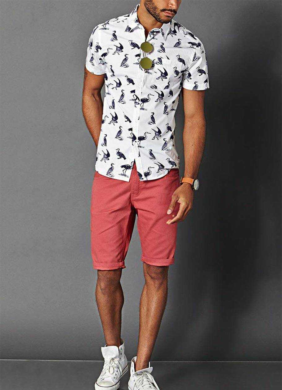 Рубашка с яркими рисунками идеально сочетается с однотонными брюками классического кроя или шортами-чинос.