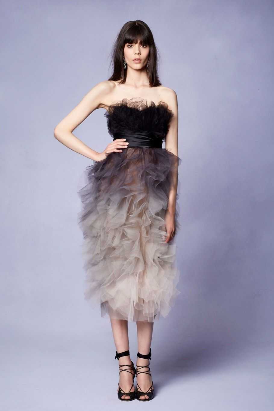 Модное новогоднее платье 2018 с оборками по всей длине юбки выбирайте с лаконичным верхом. Особенно удачно смотрятся модели с комбинированными фактурами, как у Reem Acra.