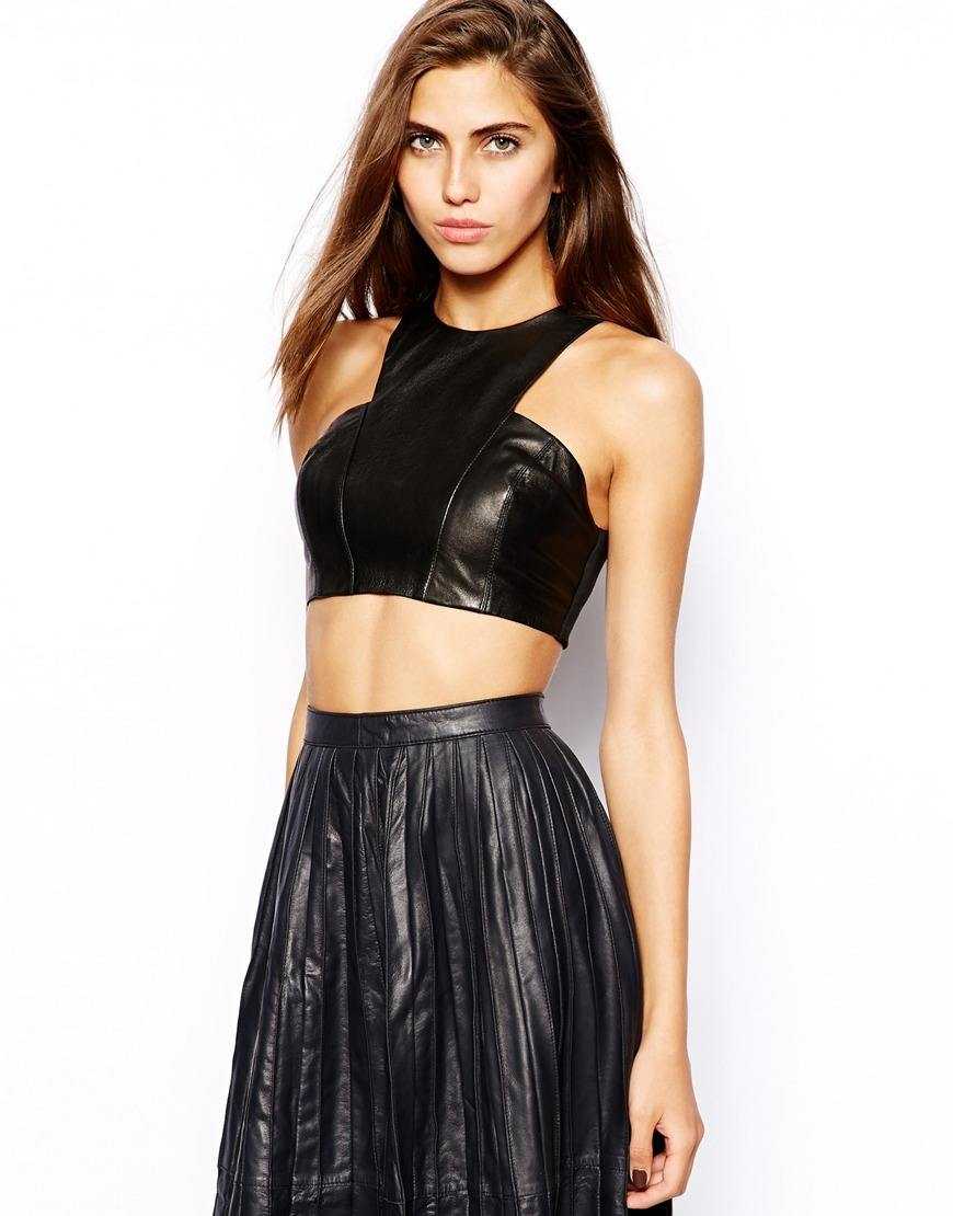 Недостатки с помощью короткого топа не скроешь, однако он прекрасно сочетается с прямыми женскими пиджаками, которые визуально делают женщину стройнее. Если вы – обладательница груди размера D и выше, то ни в коем случае не покупайте топ с инфантильными рюшами и воланами. Такие модели предназначены для женщин с маленьким бюстом.