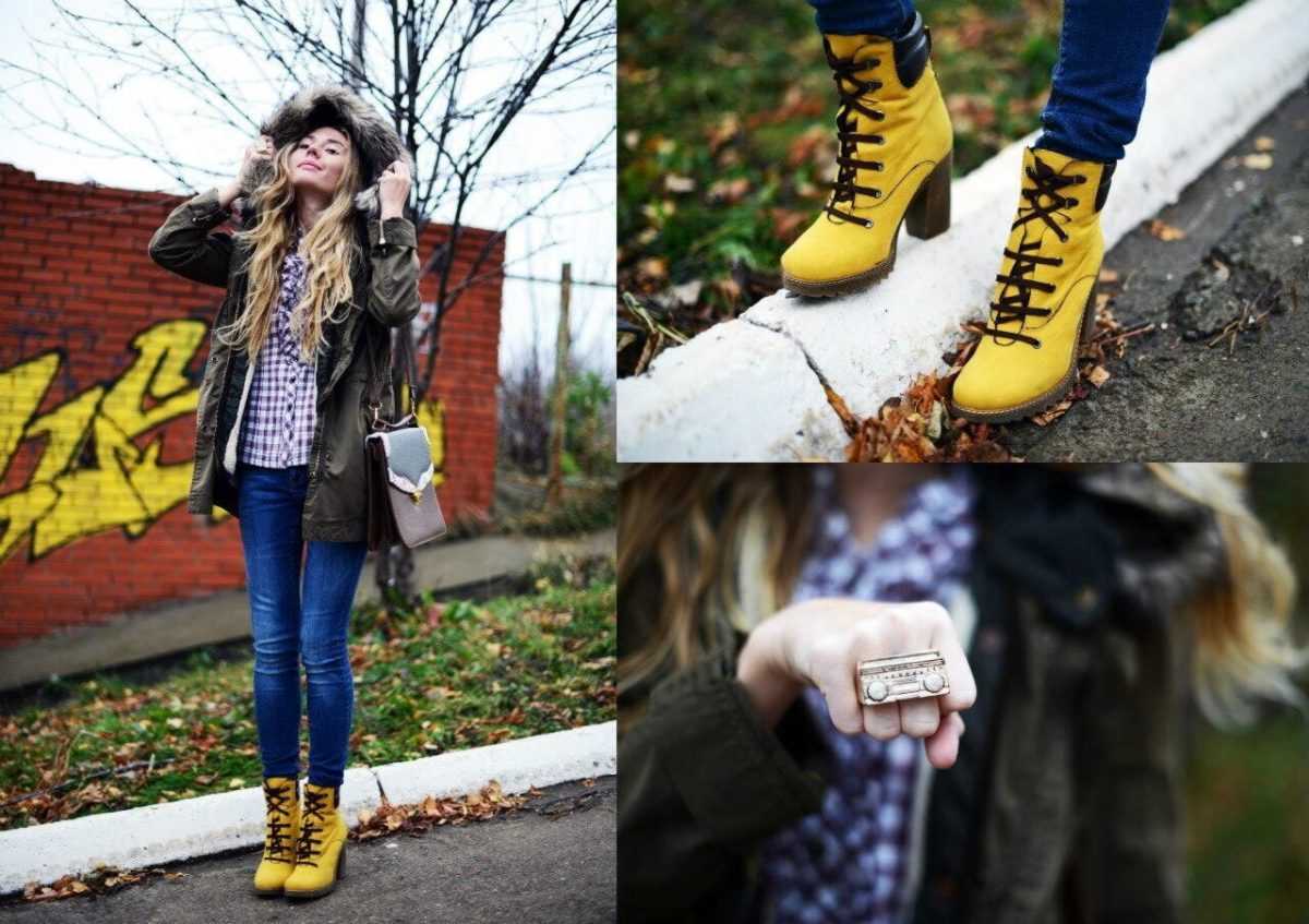 Женская обувь в мужском стиле набирает популярность. Вы будете в тренде, если наденете грубые кожаные ботинки на тракторной подошве. Стиль «милитари» и гранж пропагандируют Christian Dior, Prabal Gurung. Женские версии брутальных ботинок смягчаются декором в виде пряжек, цепочек, фигурных вырезов, сочетанием фактур, поэтому отлично смотрятся с юбками, платьями, леггинсами.