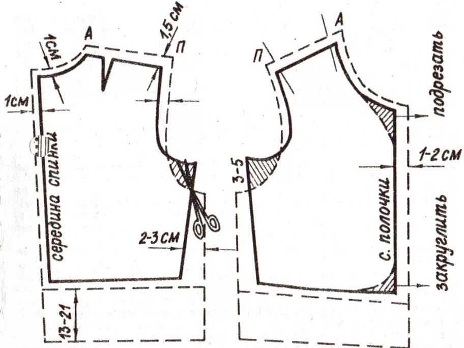 Для построения новой линии плеча продлеваем её на 5 см и крайнюю точку опускаем на 1 см. Строим новые лекальные линии проймы.