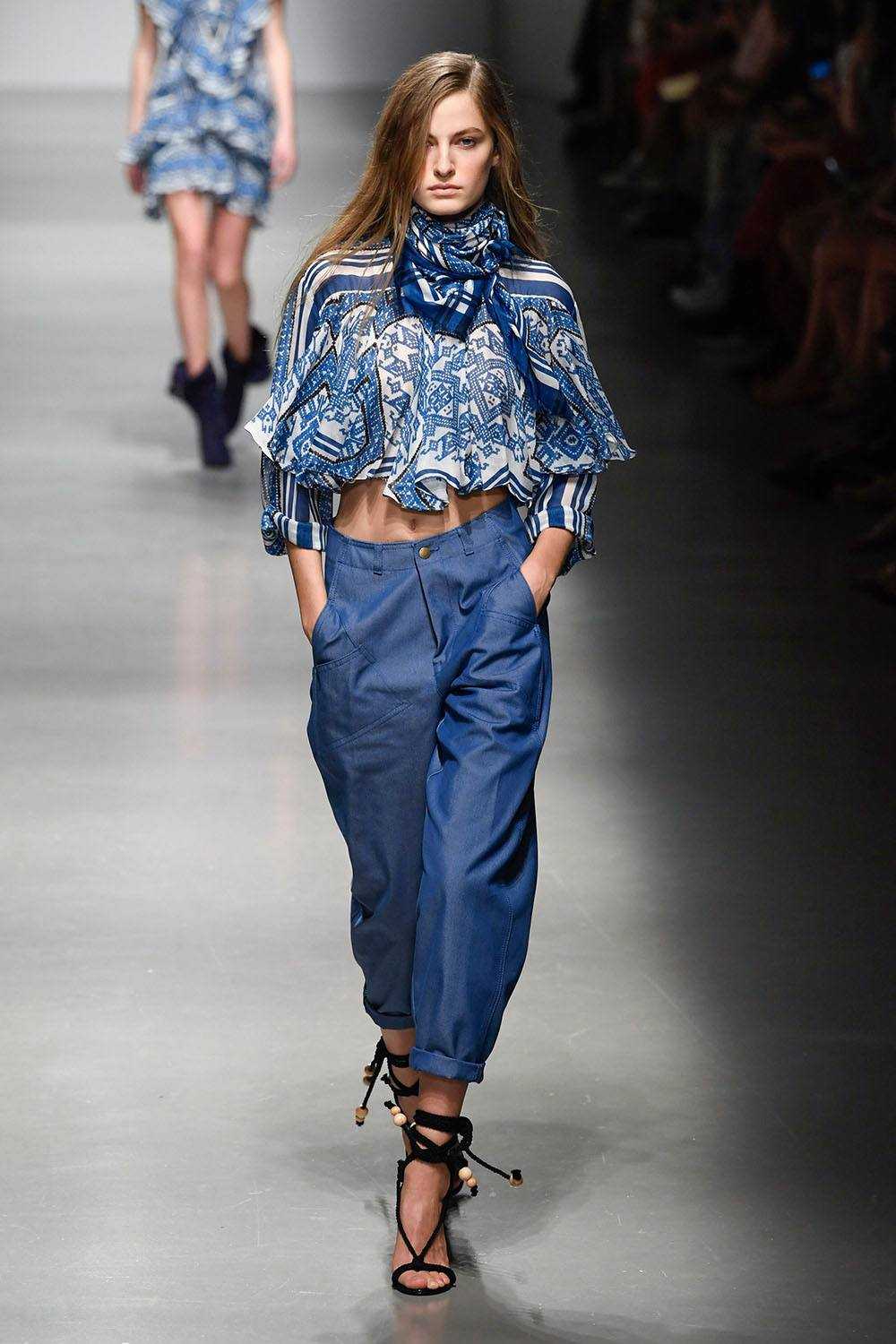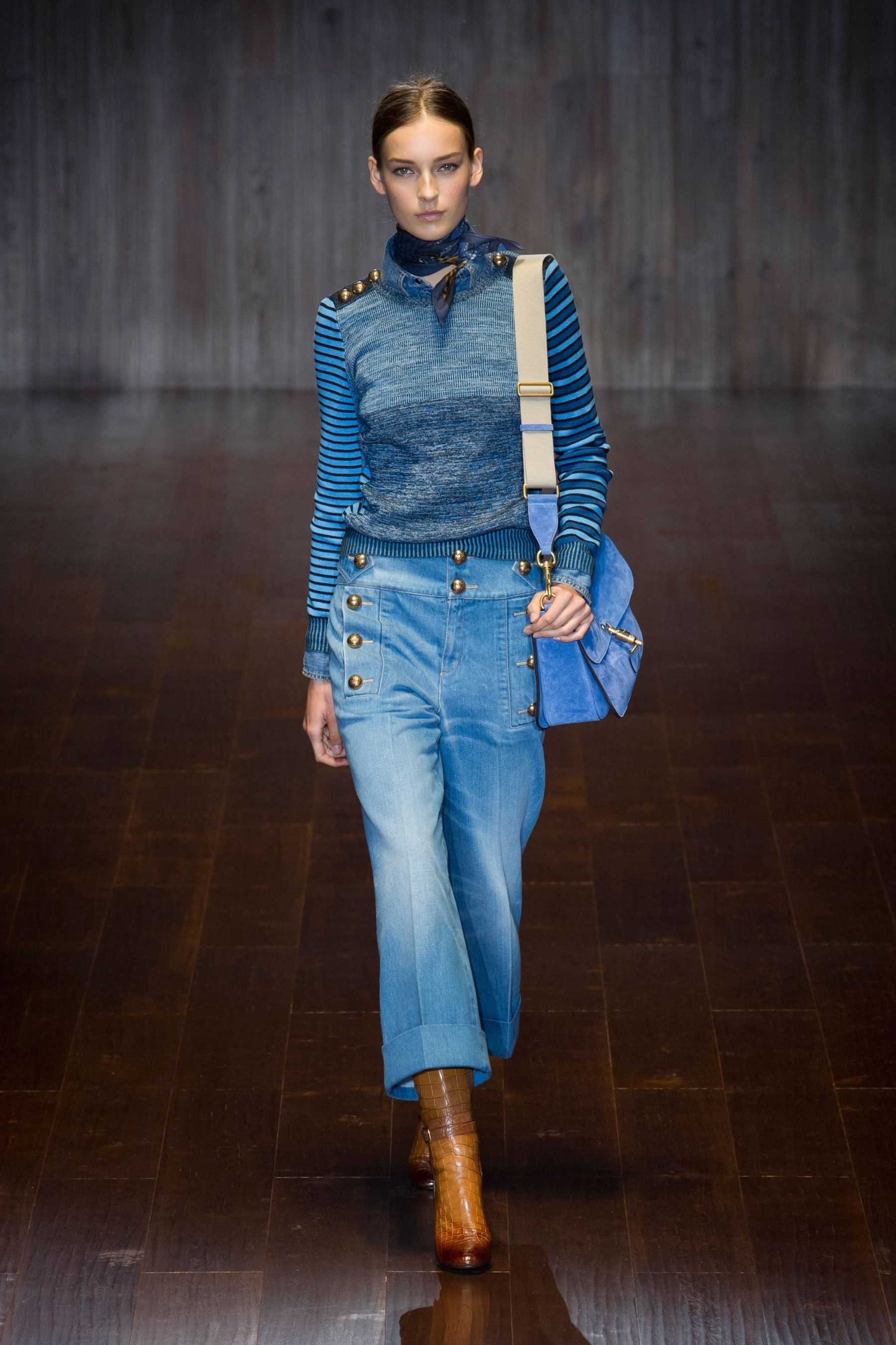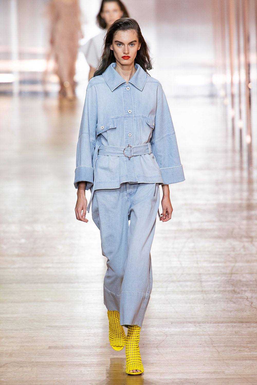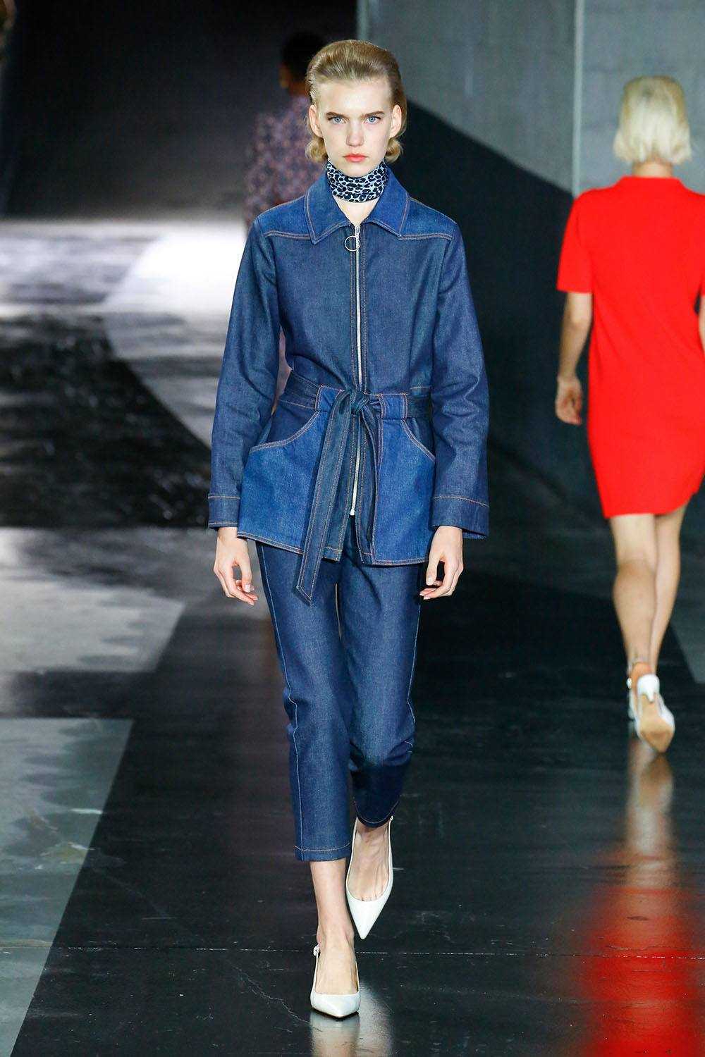 Zadig & Voltaire демонстрирует расслабленный образ, где есть всё: джинсы посветлее, джинсовая куртка потемнее, коричневые кожаные казаки, чёрная шапка, миниатюрная сумочка. Образ завершённый и демократичный: идеально для большого города. Если бы джинсы и куртка были сшиты из одного материала, получился бы скучный аналог комбинезона. Дизайнеры и модницы не любят такое однообразие оттенка.