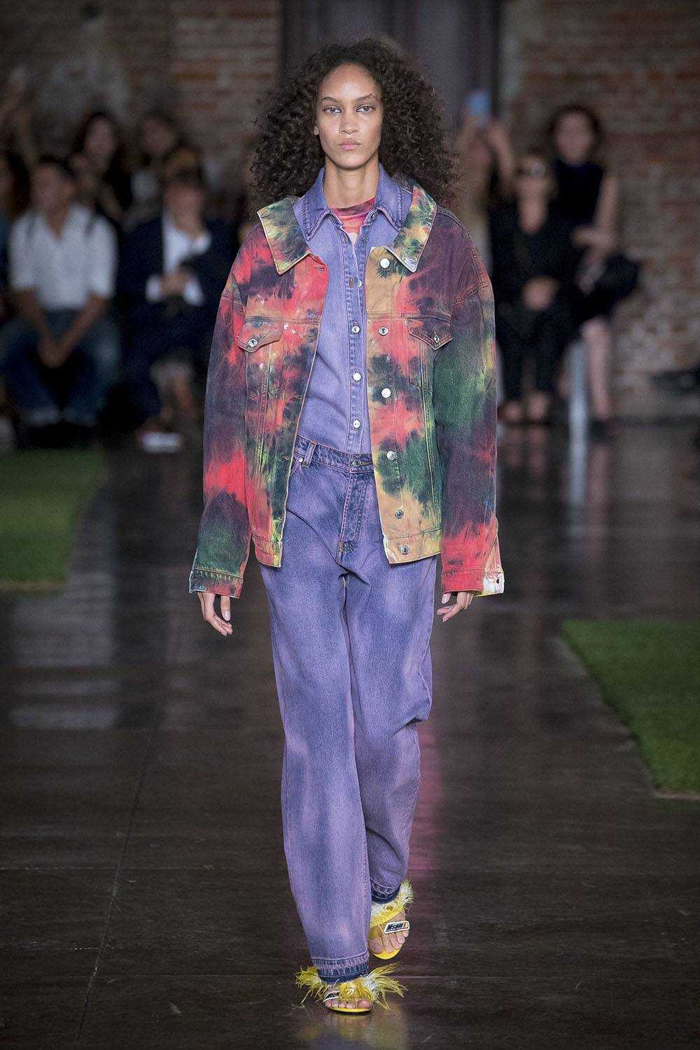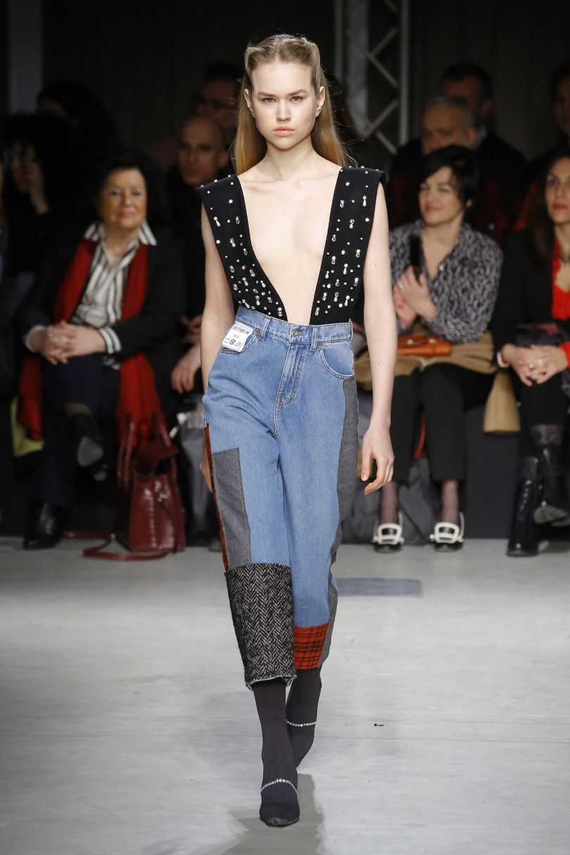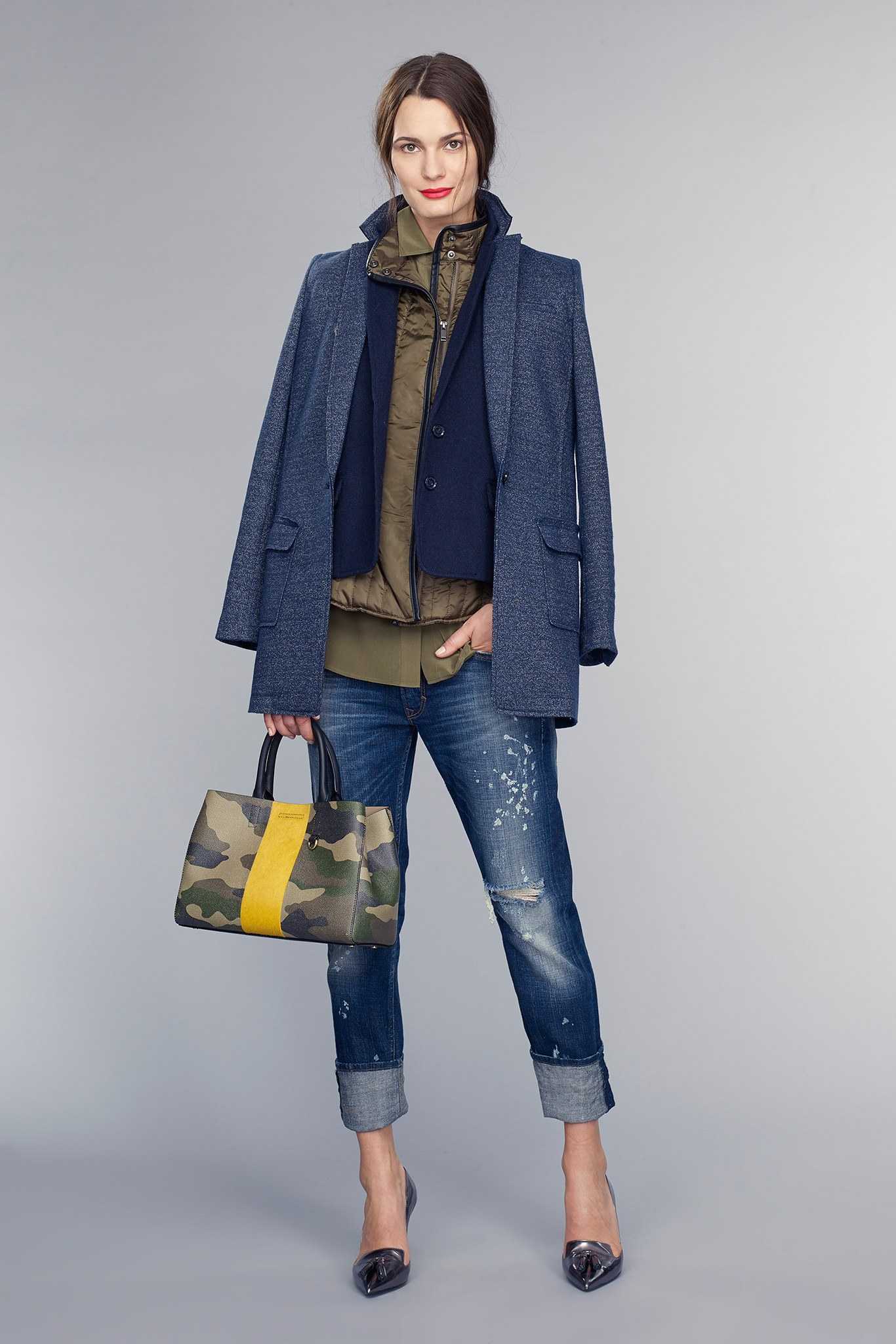 Zadig & Voltaire демонстрирует расслабленный образ, где есть всё: джинсы посветлее, джинсовая куртка потемнее, коричневые кожаные казаки, чёрная шапка, миниатюрная сумочка. Образ завершённый и демократичный: идеально для большого города. Если бы джинсы и куртка были сшиты из одного материала, получился бы скучный аналог комбинезона. Дизайнеры и модницы не любят такое однообразие оттенка.