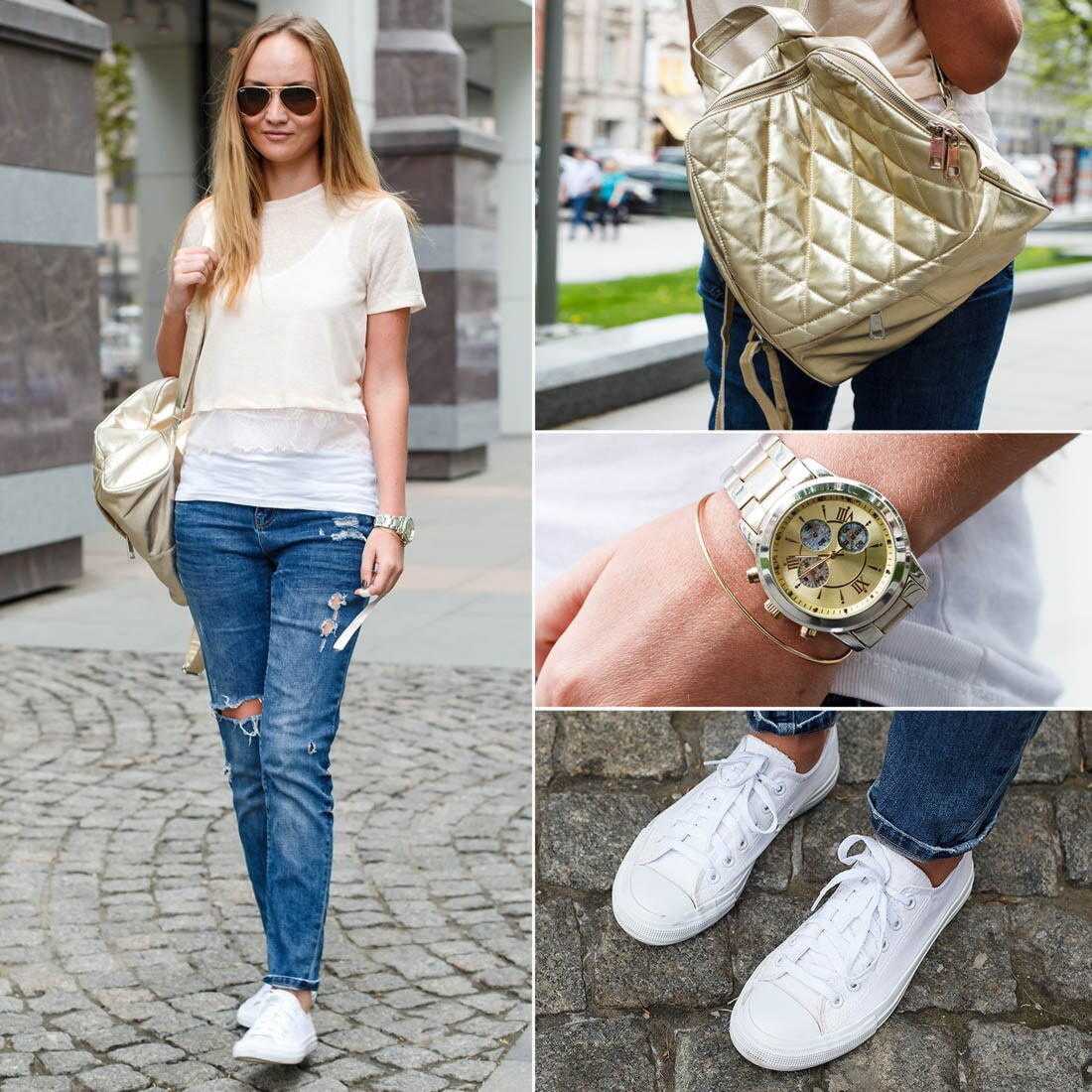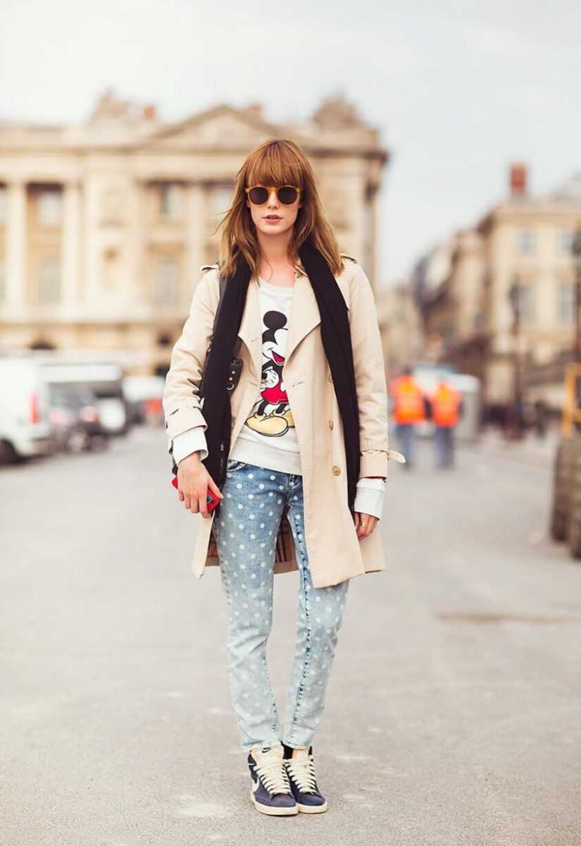 Сочетая джинсы с майками, футболками, кардиганами и джинсовыми куртками, образ будет повседневный. Что касается обуви, то в данном случае можно выбирать различные кеды, кроссовки, туфли без каблука и многое другое.