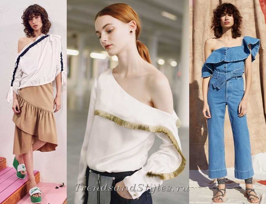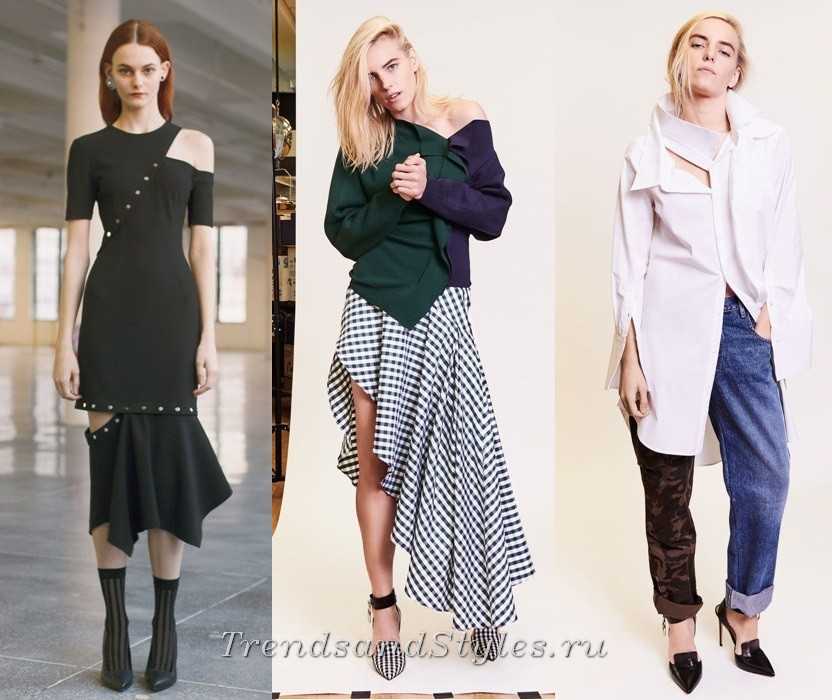 Асимметрия кажется завладела умами мастеров-дизайнеров. Обилие женской одежды осень-зима 2018-2019 в таком исполнении сразу стала заметна с первых показов. Это юбки и платья с неровной линией низа и исполненные на одно плечо. К ним добавились блузы и многочисленные топы, открывающие руки женщин и сшитые из разноцветных деталей. Даже брюки некоторые дома мод представили не только с разным оттенком и узором штанин, но и кроем.