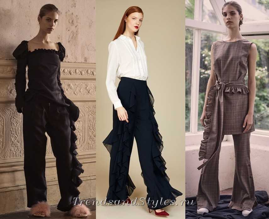 Стремление многих домов мод украсить и подчеркнуть красоту своих вещей подарило нам тенденцию украшать женскую одежду сезона осень-зима 2018-2019 волнистыми рюшами. Их можно увидеть на многочленных праздничных платьях и повседневных вещах: брюках, топах и даже аксессуарах ( сумках, туфлях).