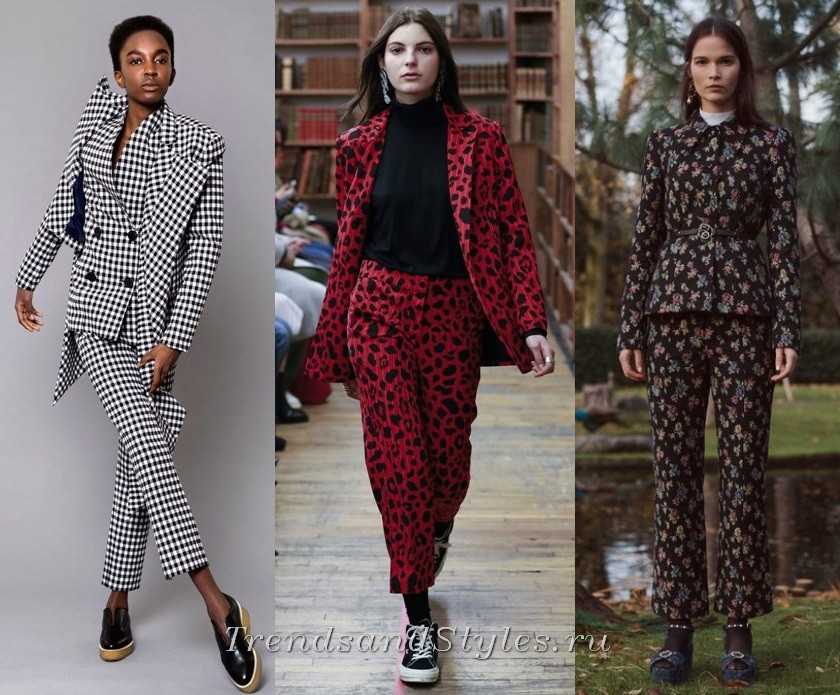 Женские брючные костюмы, представленные в виде костюмов-двоек или трек, будут в центре внимание за счет модных принтов. Часто брюки в таких узорчатых ансамблях едва достигают щиколотки женских ног