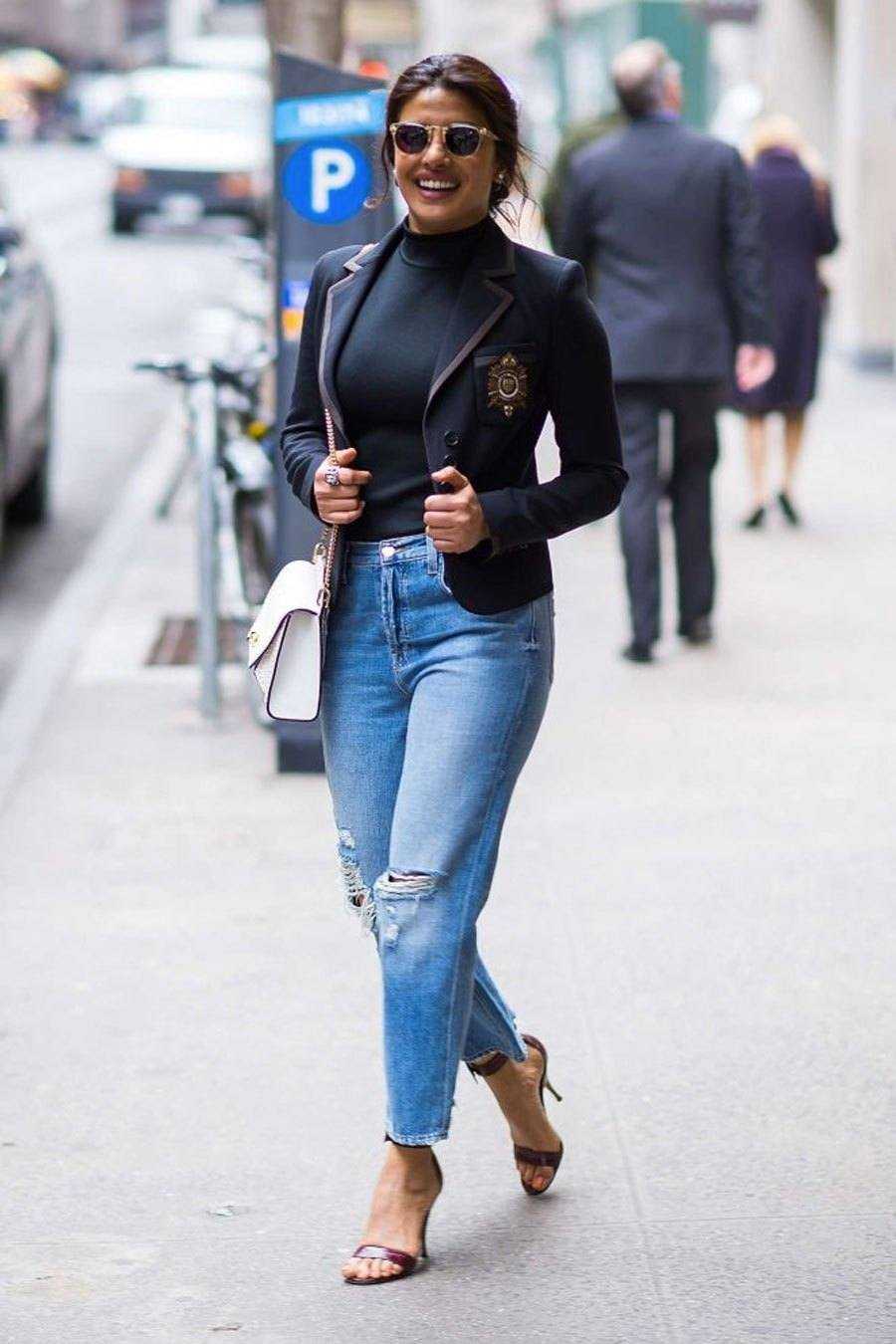 Образ на фото внезапен, поскольку демонстрирует, что даже в джинсах можно выглядеть элегантно. Верх для торжества, низ для повседневности. Продумана каждая деталь, а вместе они звучат в необыкновенном, запоминающемся ансамбле.