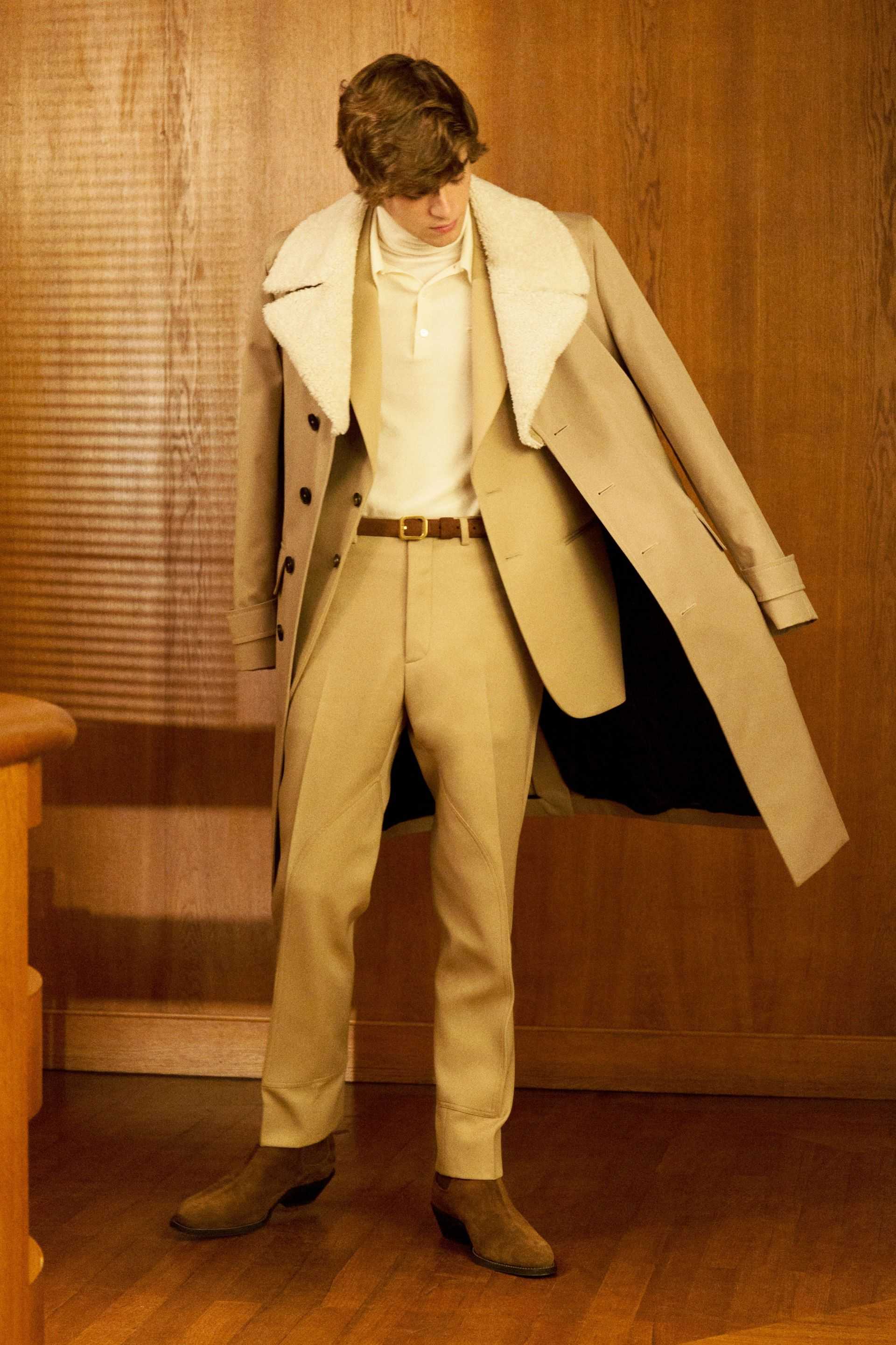 Образы Лоренцо Цурцула постепенно меняются. Мы видим его и в уютном мягком костюме со свободными брюками, и в классическом пальто с меховым воротником, выполненном в бежевых тонах, но главным выделяющимся элементом в них являются большие бесформенные сумки.