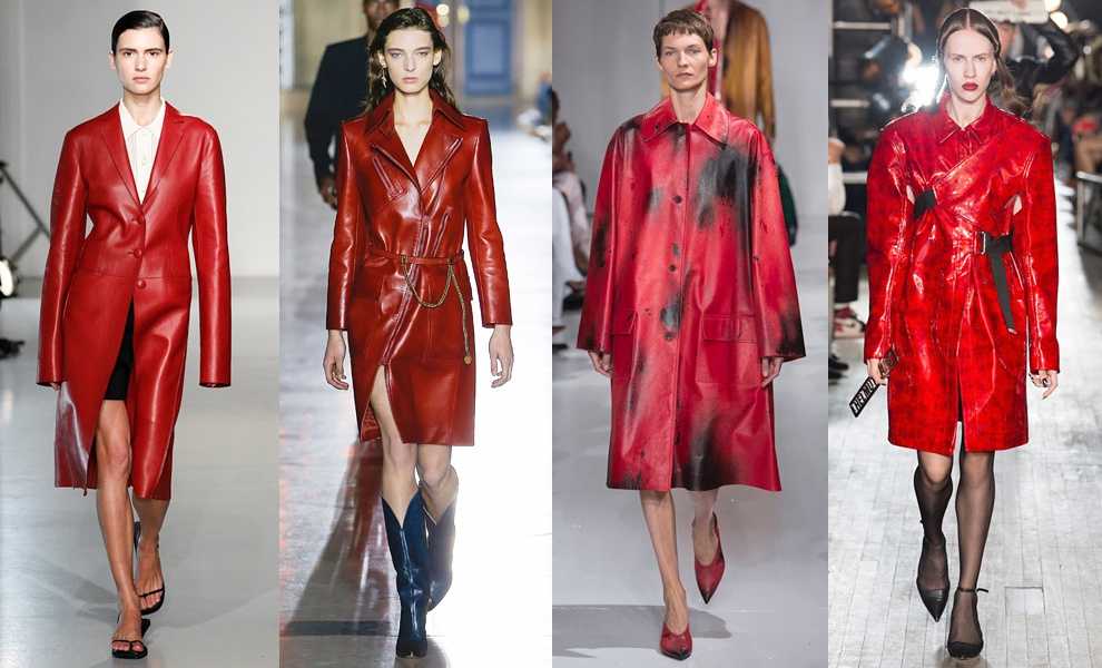 Несмотря на летнюю жару в 2018 в тренде будут изделия из кожи. Особенно популярными станут красные плащи, которые дополнят изысканный образ прохладными вечерами. Их можно носить с майками, блузками, брюками и юбками. Модели на подиуме демонстрировали образы, где плащ надевается на голое тело.