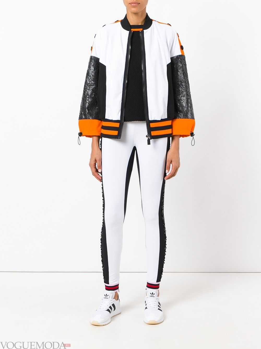 Цветовая гамма спортивных костюмов идёт наравне с модой неспортивной одежды. Многие дизайнеры предпочитают базовые тона – серые, белые, красные и черные. Зимой будут актуальны голубо-белые сочетания, бирюзовые, розовые и сиреневые. Уже стала популярной комбинация цветов. Например, куртка и штаны сделаны в одинаковой цветовой гамме, но верх комплекта более темнее. Спортивную куртку можно носить и с самыми обычными скинни-джинсами или другими брюками. Это довольно-таки практичный и тёплый вид одежды на повседневную жизнь.