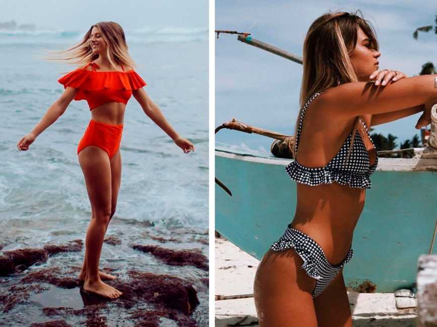 - Какой купальник покупать? Чтобы быть фешн-пляжницей выбирайте купальник с рюшами, купальник со шнуровкой или подтяжками. Актуальные гаммы — красные, нюдовые, полосатые и классические черные.