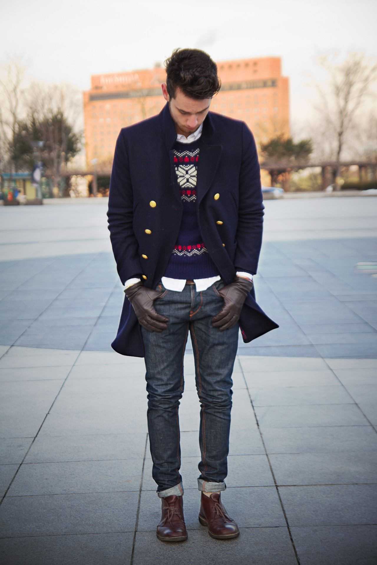 Важно помнить, что с таким «зимним» верхом модели джинсов, оголяющие щиколотки выглядят смешно и неуместно. Длина штанин должна быть классической или в пол для клешей.