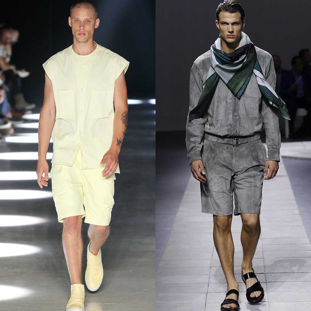 Среди революционных новинок ультракороткие облегающие шорты, майки с фигурным вырезом – все, что помогает продемонстрировать результат упорной работы в спортзале. Также дизайнеры предлагают юбки и юбки-шорты, обычно довольно скромные. Однако Louis Vuitton выставил целый ассортимент мужских юбок, от макси и мини до комбинированных, в том числе пышных.