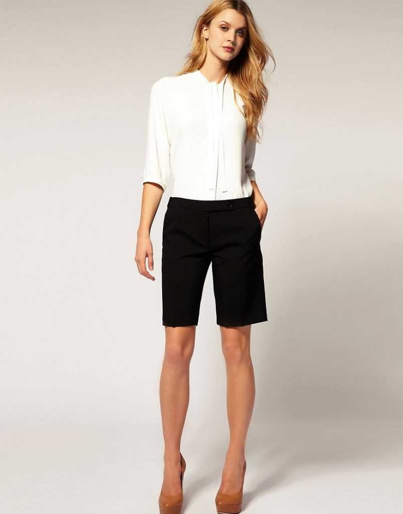 Если все лето вы планируете провести в офисе, то вам подойдут шерстяные, атласные или хлопковые шорты средней длины. В дополнение к ним можно надеть блузку.