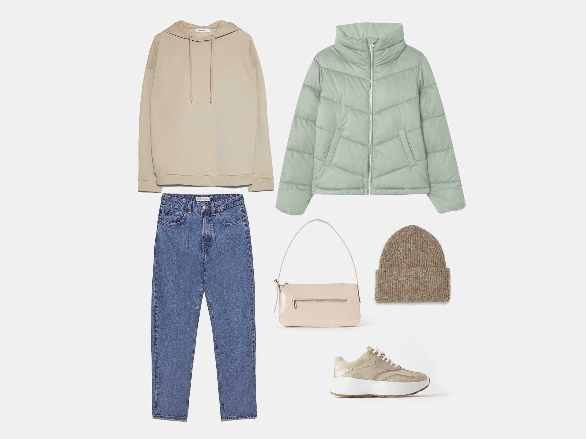 Соберем образ в актуальной бежево-мятной гамме. Наденем худи, шапку-бини, удобные кроссовки, а также объемную стеганую укороченную куртку. Образ завершит трендовая сумка-багет бежевого цвета.