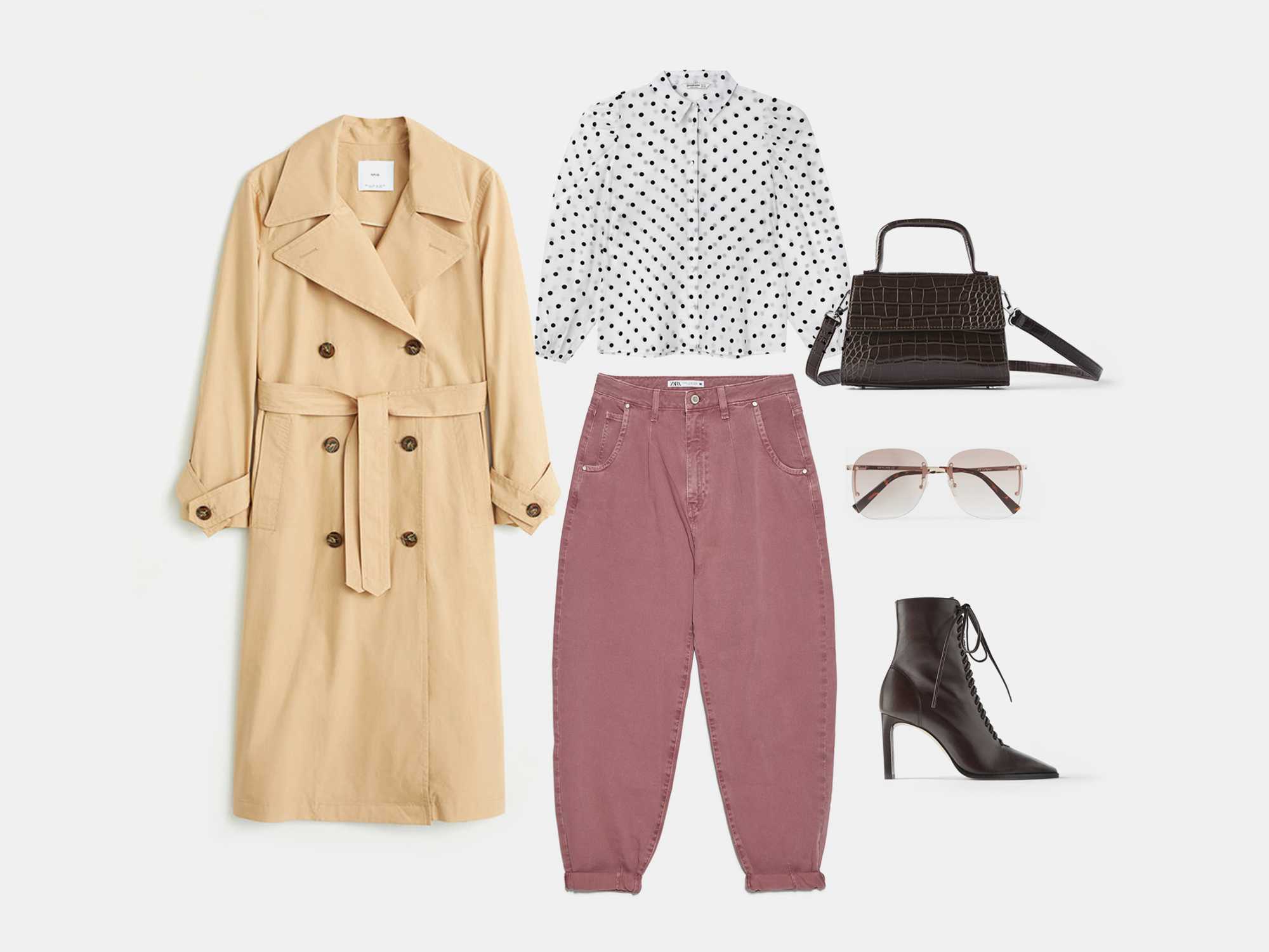 Весна – идеальное время для экспериментов с цветом джинсов. Остановите свой выбор, например, на пыльно-розовом цвете. С такими джинсами можно создать интересный свежий образ. Добавьте к ним легкую рубашку в горошек с объемными рукавами. В качестве обуви возьмите коричневые ботильоны с квадратным носом. Сверху надеваем базовый бежевый тренч. И не забудьте про солнечные очки, ведь весна и на улице уже солнышко.