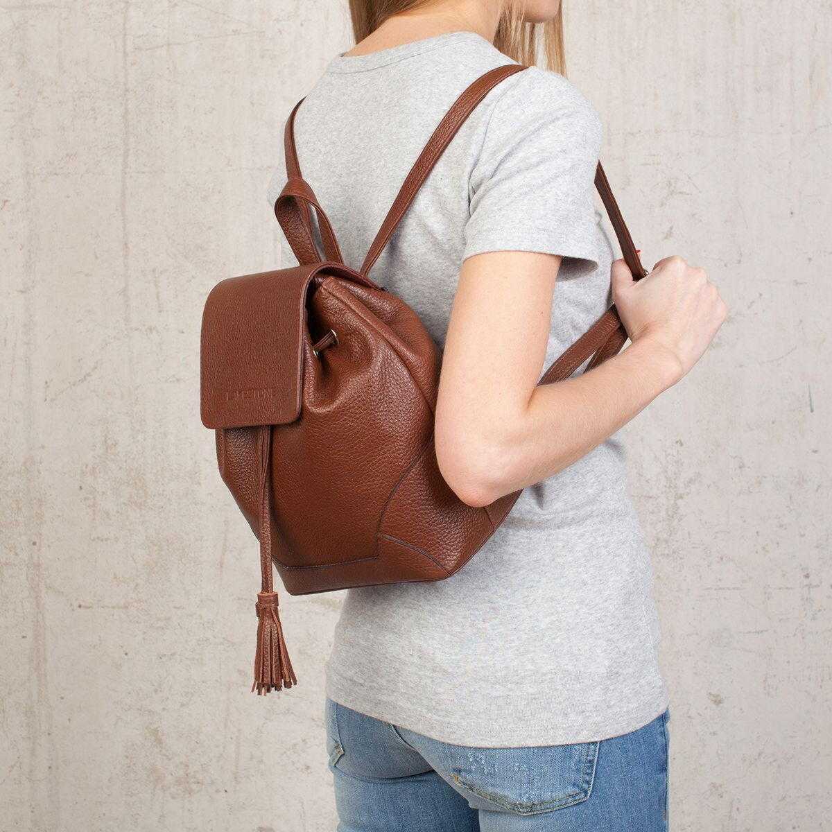 Ряд рюкзаков из натуральной кожи может похвастать лаконичным декором: косичками и кисточками из того же материала, что и сам аксессуар. Этот вариант смотрится интересно, а в ряде моделей при желании кисти отстегиваются. Отсутствие ярких элементов и декор тон в тон добавляет фактурности аксессуару.