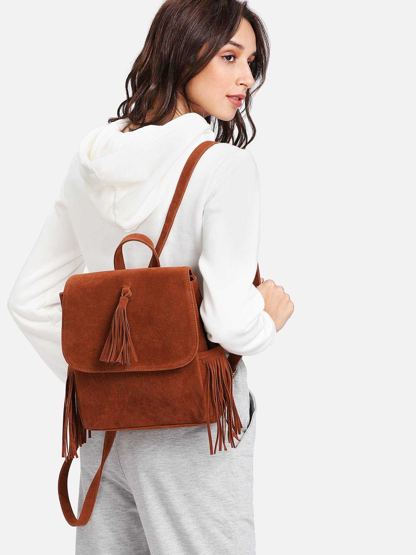 - рюкзаки с бахромой, выполненные в коричневом цвете, лучше всего смогут завершить образ в стиле бохо;