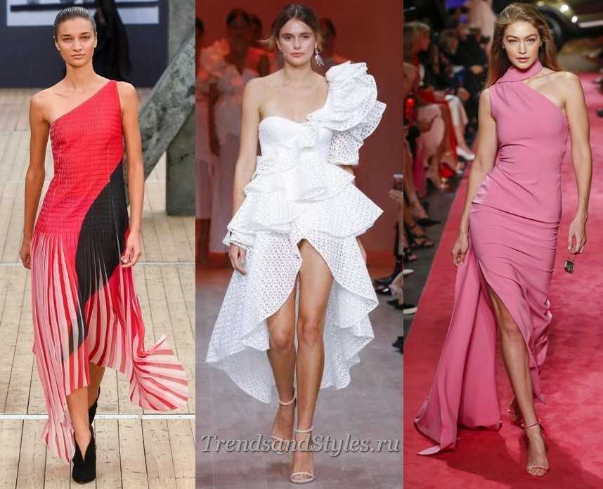 Платья на одно плечо сезона весна-лето 2019 создают особенный вид нарядов в числе асимметричных уборов. Это могут быть модели с рукавом, бретелей, украшенные широкими оборками или элегантным длинным шарфом в качестве завязки.