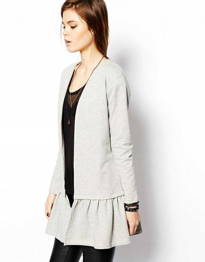 Пеплум – наиболее утонченный и самый женственный вариант. Характерной особенность — баска на талии или в нижней части, позволяющая скорректировать фигуру. Что носить под пиджак такого фасона вопрос не стоит – он сочетаем как с юбкой-карандаш, так и с классическими или расклешенными брюками.