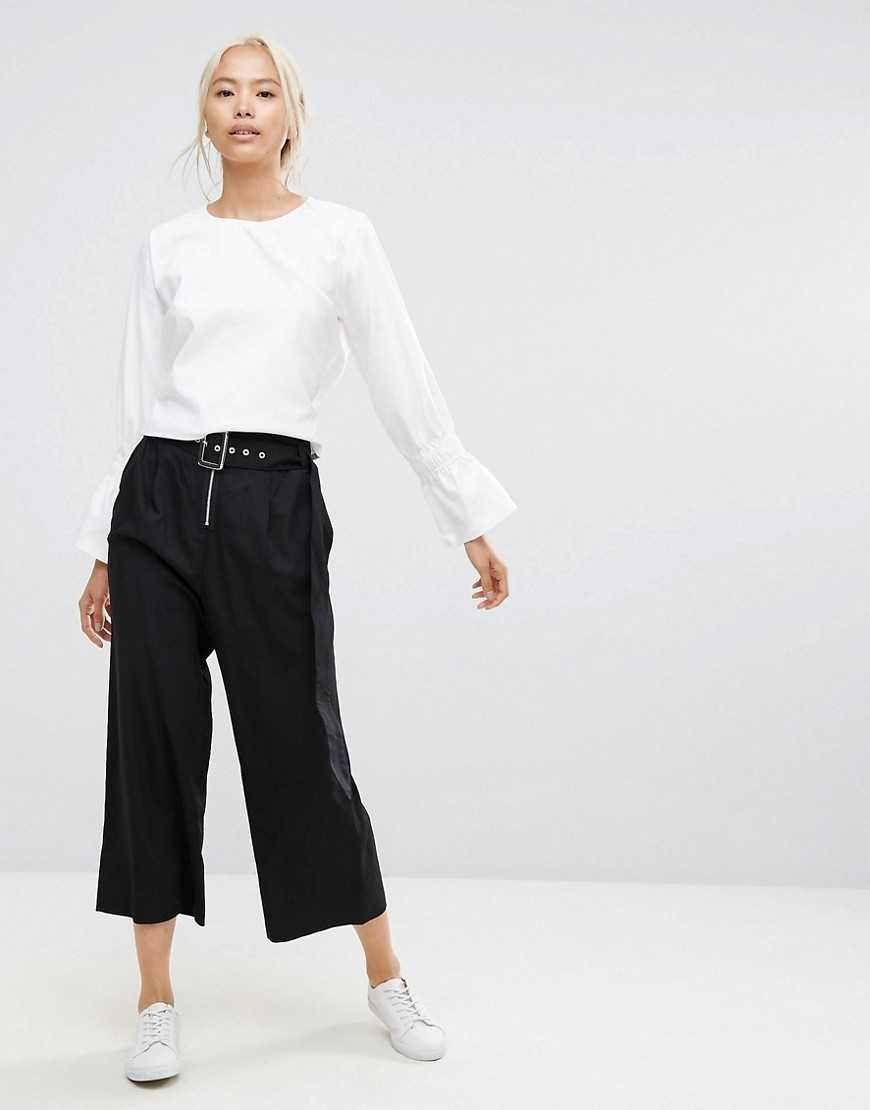 Эстетические вкусы восьмидесятых годов стремительно набирают популярность с каждым сезоном. Брюки с расклешенными штанинами от бедра вновь занимают вершины модных олимпов. Брюки-палаццо также порадовали в этом сезоне своей разнообразностью и неординарностью. Они уместны при сочетании с разными стилями и образами. Отлично будет выглядеть комбинация с широкой кофтой свитшот, которая небрежно заправлена в брюки из плотного материала. Дополнить такой интересный образ по желанию можно элегантным пояском из плотной грубой кожи и ботинками с блочным удобным каблуком. Если же девушка предпочитает офисный строгий стиль, тогда следует в свой гардероб добавить несколько водолазок и белых рубашек в стиле оверсайз. Ну а для вечернего наряда однозначно стоит увеличить высоту каблука и разбавить броские расклешенные брючки шелковой блузой или топом.