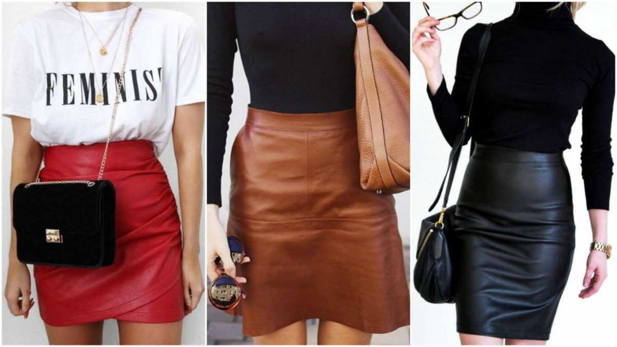 Кожа – на пике популярности в 2019 – 2020 году. Для моделей из неё дизайнеры выбрали фасоны карандаш, трапеция, А-образный силуэт и среднюю длину, поэтому образы с кожаными изделиями подойдут для офисных луков.