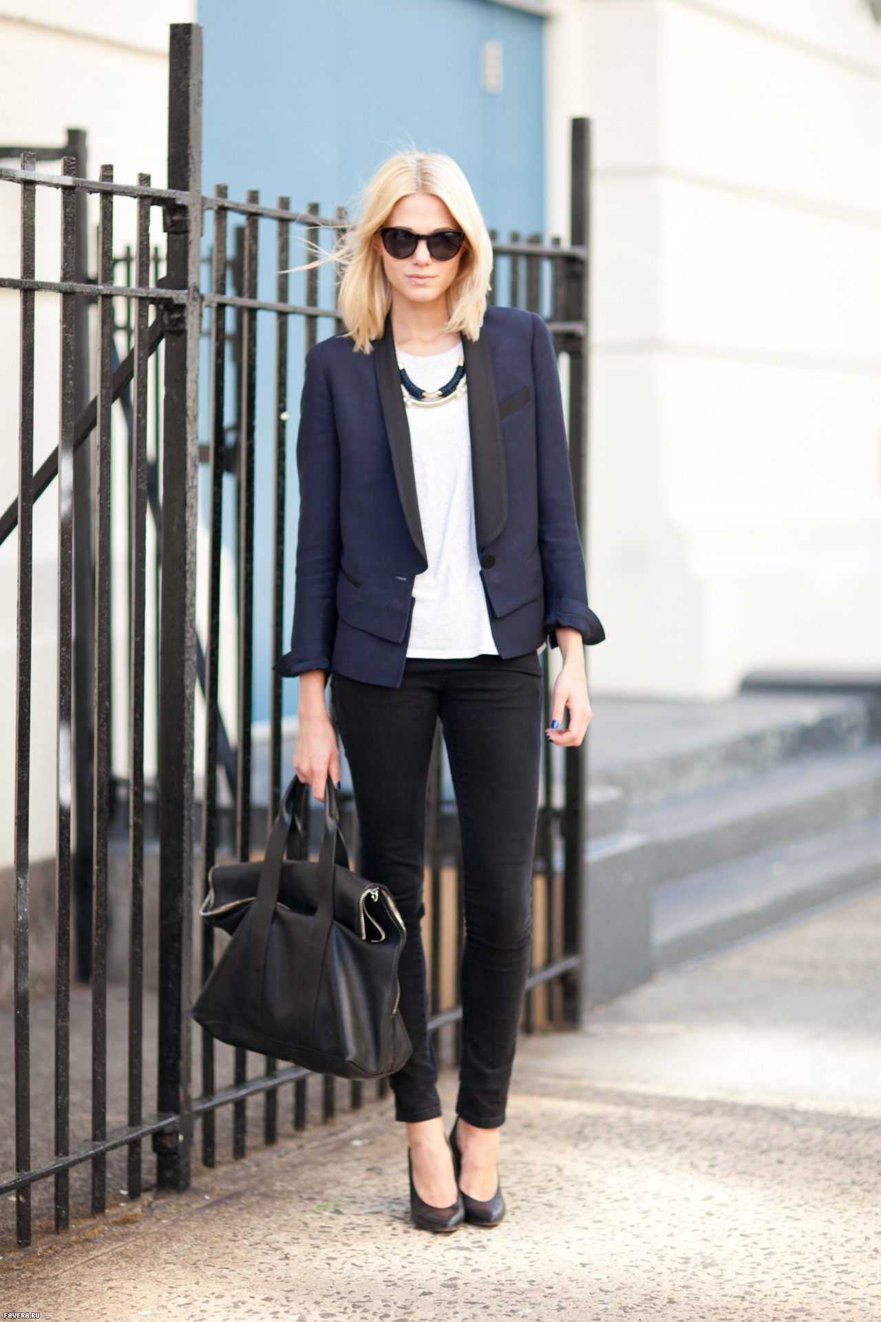- Зауженные джинсы + шелковый топ + свободный френч.