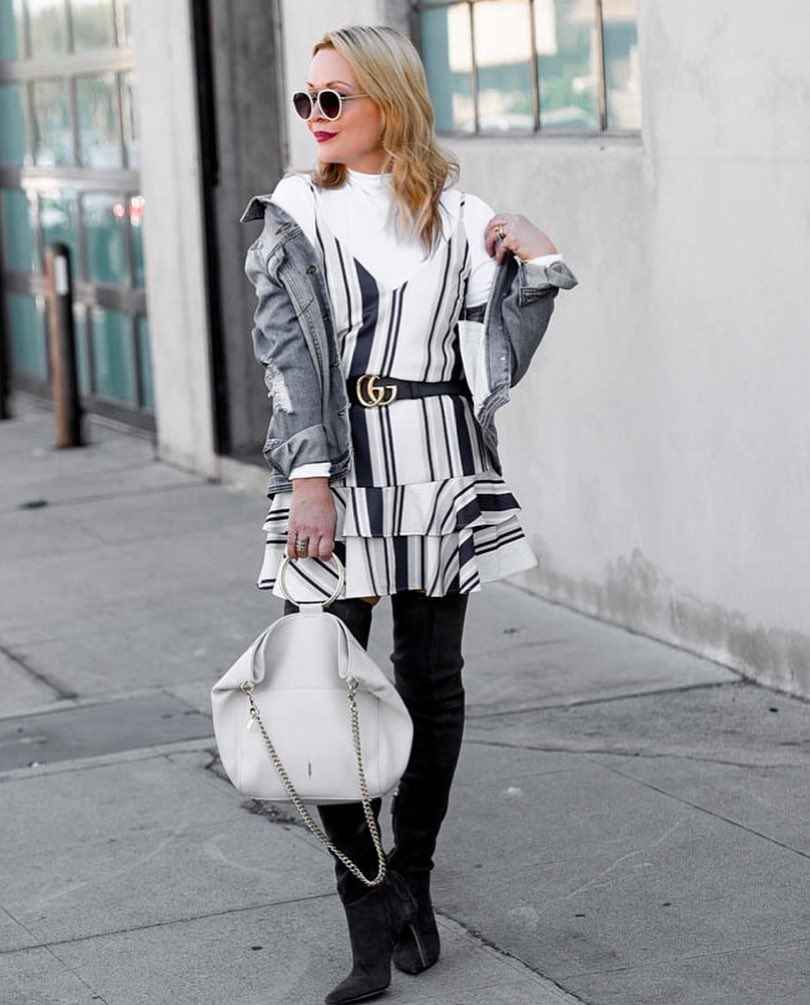 - Высокие сапоги-ботфорты гармонично смотрятся с платьями и юбками любой длины. Интересно сочетаются с короткими шортами и пальто оверсайз.
