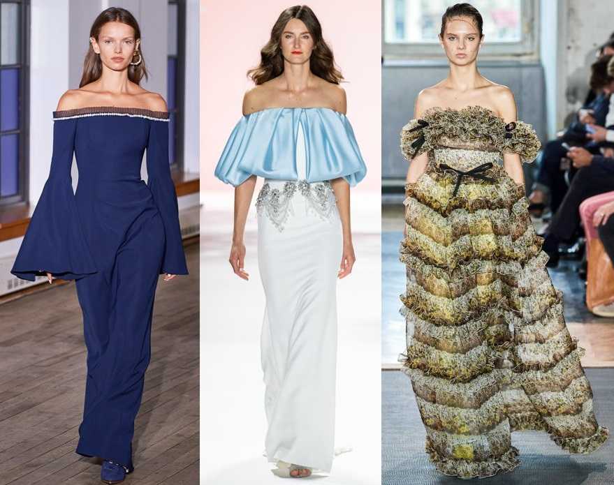 Открытые плечи — еще один тренд 2020 года. Дизайнеры многих брендов кроме традиционных фасонов бюстье наполнили свои коллекции вечерними платьями с ниспадающим рукавом или бретелями. И каждое такое платье, как на фото ниже, кажется уникальным, неповторимым.