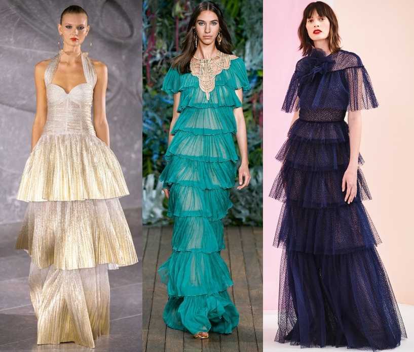 Вечерние многоярусные платья 2020 завладеют вниманием красавиц колыханием разных слоев из воздушных материалов. Такие одежды — прекрасный вариант решения вопроса, что одеть на выпускной 2020, они очень романтичны и женственны, отлично подходят для юных стройных красавиц