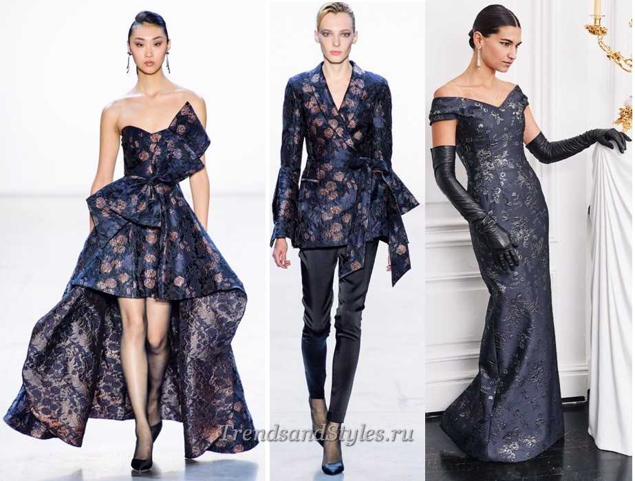 Глубину оттенка подчеркивают серебристые и золотистые тона. Поэтому так часто в вечерней моде 2019-2020 встречаются наряды с блестящей вышивкой на темном фоне.