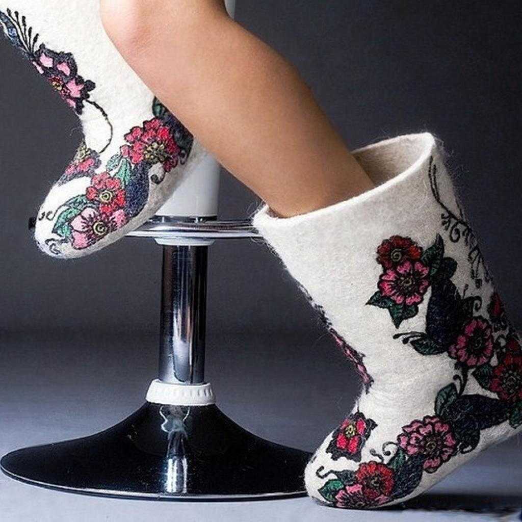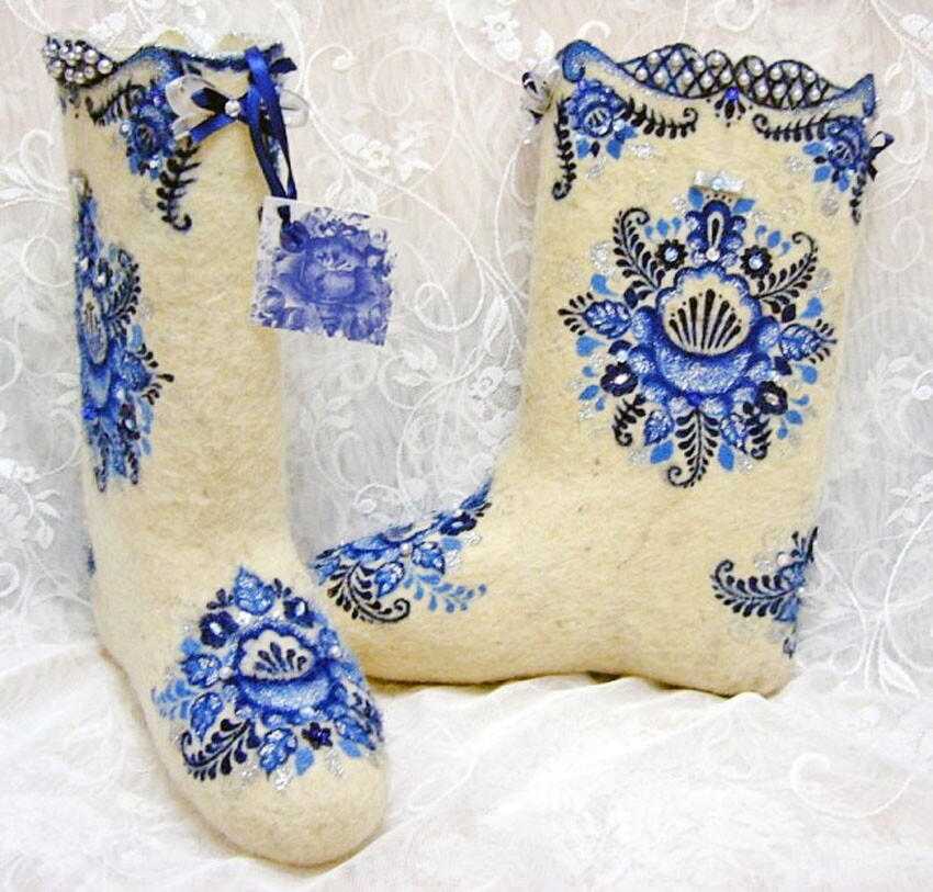 - высокие, длиной от середины икры до колена с вышивкой, рисунком, аппликацией, необычным окрашиванием, декором, выполненным в технике сухого валяния.