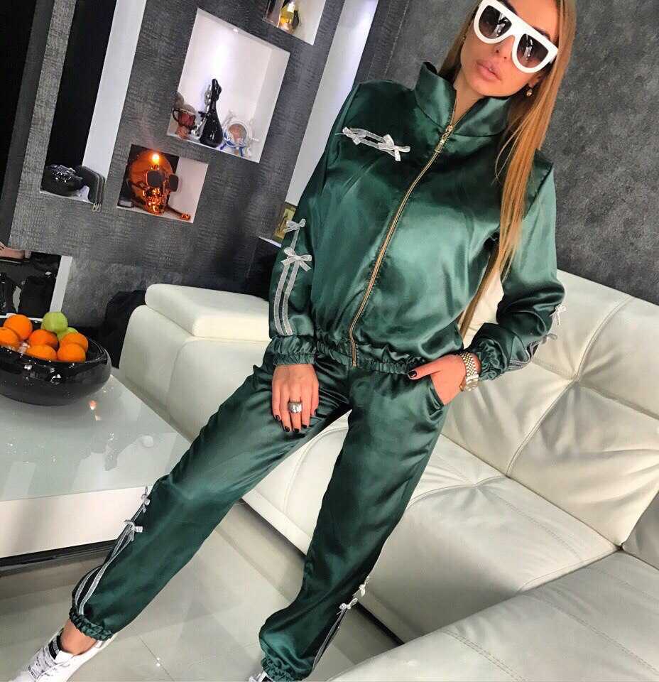 Зачастую подобными принтами украшают только верхнюю часть модного женского спортивного костюма 2019 года (футболку или толстовку), однако нередко используются интересные идеи оформления и на брюках.