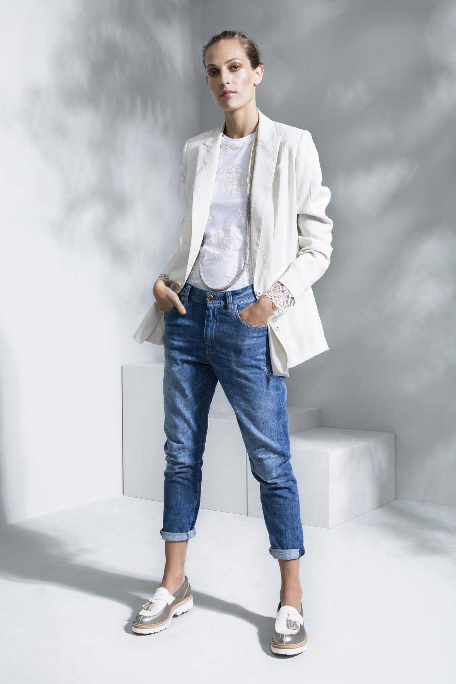 - Нарядные ансамбли позволит создать белая кофта, выполненная из шелка и атласа, совмещенная с черными джинсами.