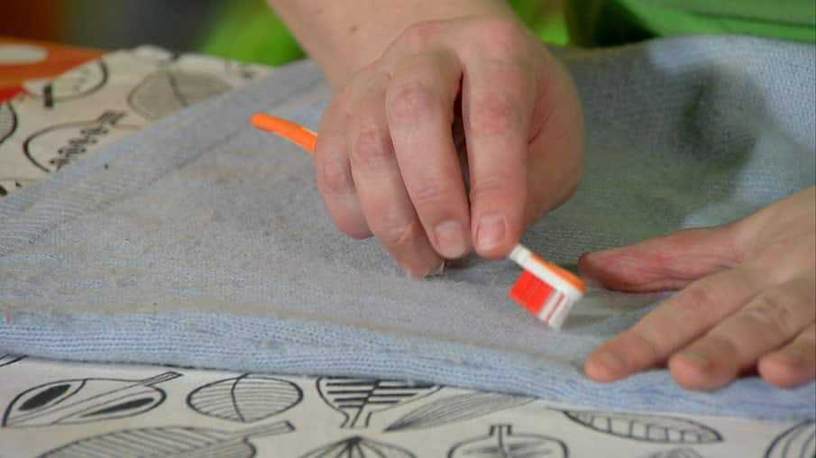Многие хозяйки пробовали пользоваться зубной щеткой. Результата может получиться хорошим, если правильно все делать. Если водить щеткой против ворсинок, то ткань может растянуться и изделие потеряет первоначальный вид и будет деформированным.