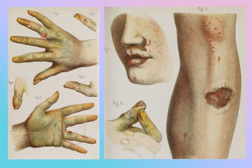 Так мышьяк разъедал лицо, руки и ноги работников мастерских по изготовлению искусственных цветов. Хромолитография из книги Максима Вернуа